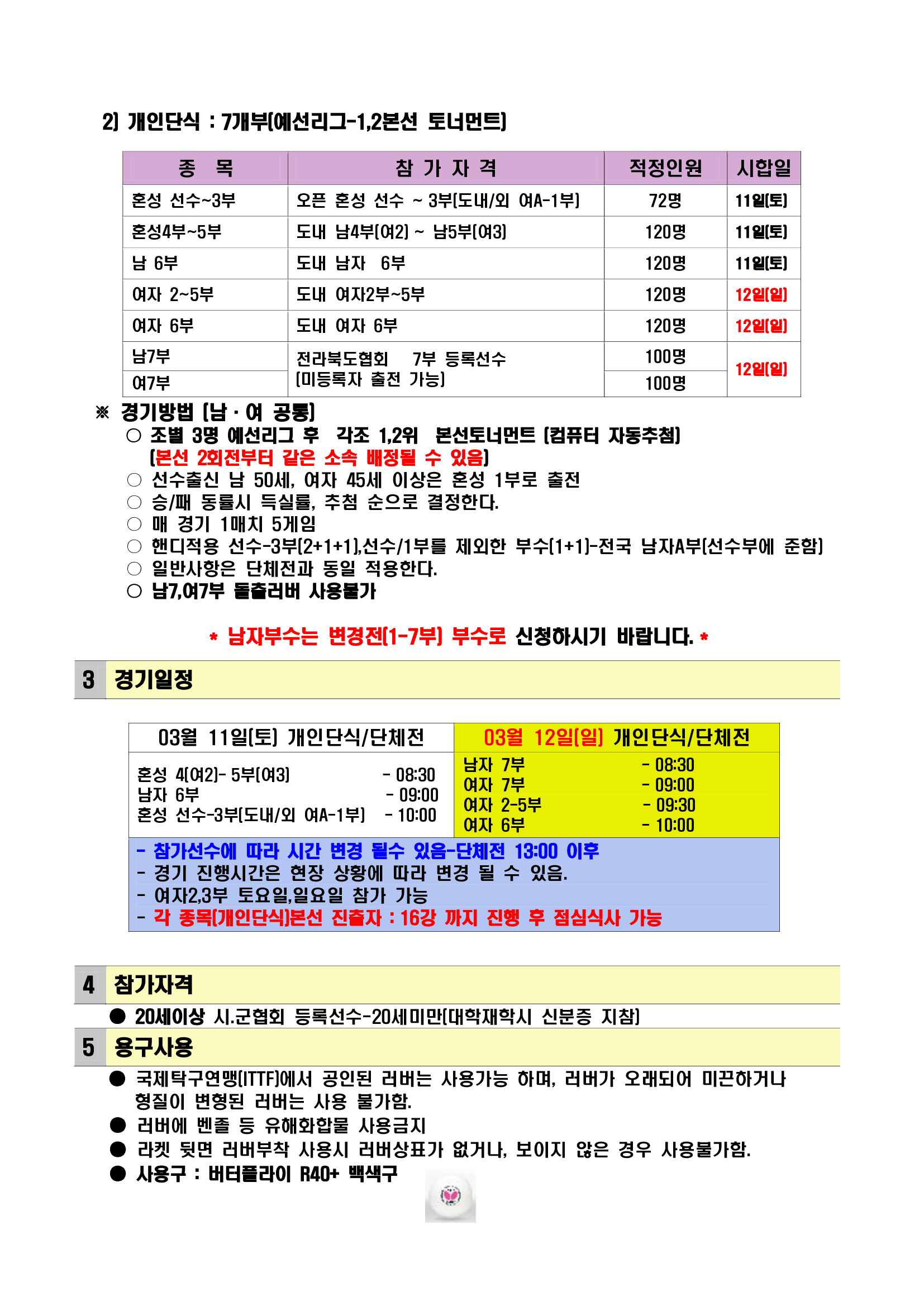3. 남자부수 수정안(선수-8부) 대로 접수바랍니다.(남녀간 부수적용 대회요강 참조)