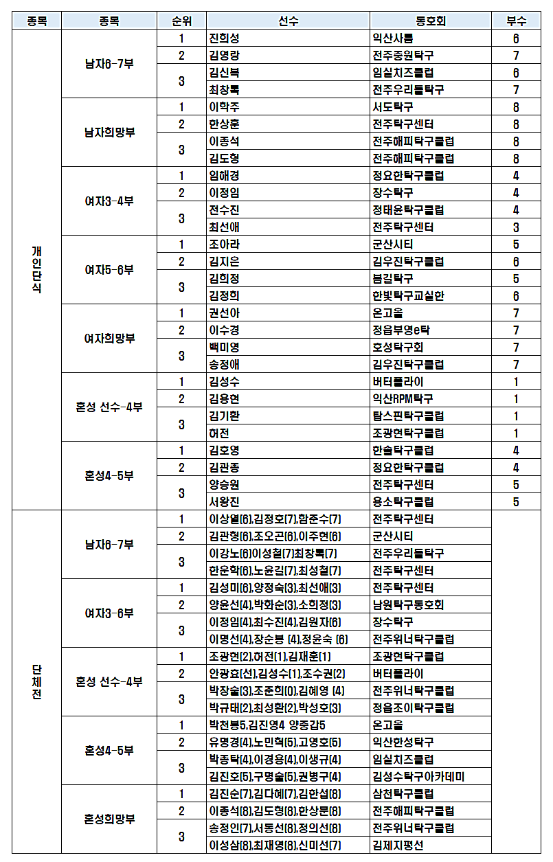 전주탁구센터 김성미 여자단체전 우승으로 여자6부->여자5부로 승급인데, 누락되었습니다.